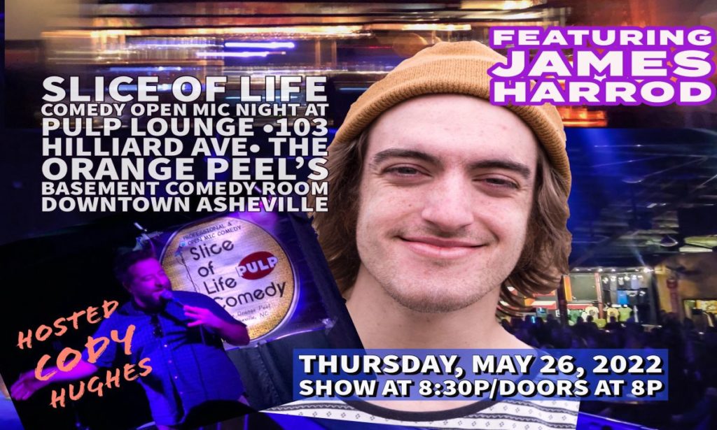 Thursday May 26, 2022Slice of Life Comedy presents the return of comedy nights at The Orange Peel’s Pulp Lounge in Asheville, NC.
