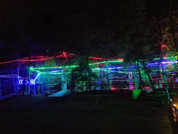 Join us Thanksgiving Weekend and during the Holidays for our Twilight in the Treetops. Imagine climbing 10, 20, 30-40 feet in the air and zipping along a hang glider or a sky kayak in the largest adventure park in Western North Carolina. Then, as the sun starts to set, the aerial challenges become illuminated with over 15,000 colored twinkle and laser lights. Five of the Adventure Park’s aerial trails become illuminated with all their leaves, cables, ropes and platforms.